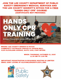 FREE Hands Only CPR Training, hosted by the Lee County Sheriff’s Office. Located in the Edison Mall Outreach Center.