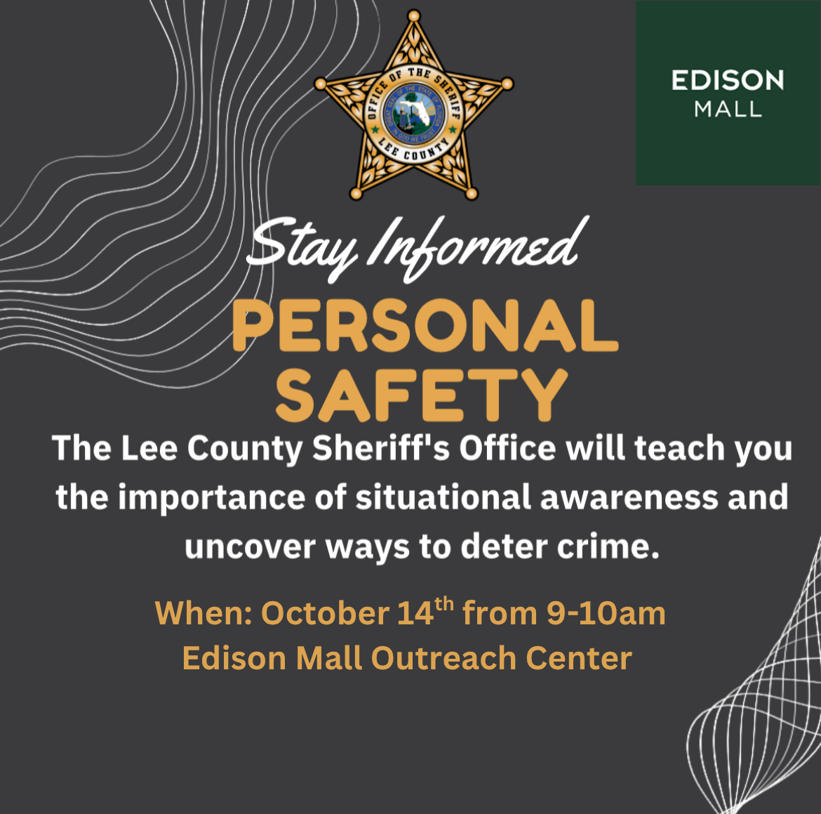 The Lee County Sheriff's Office will teach you the importance of situational awareness and uncover ways to deter crime. Located in the Edison Mall Outreach Center.